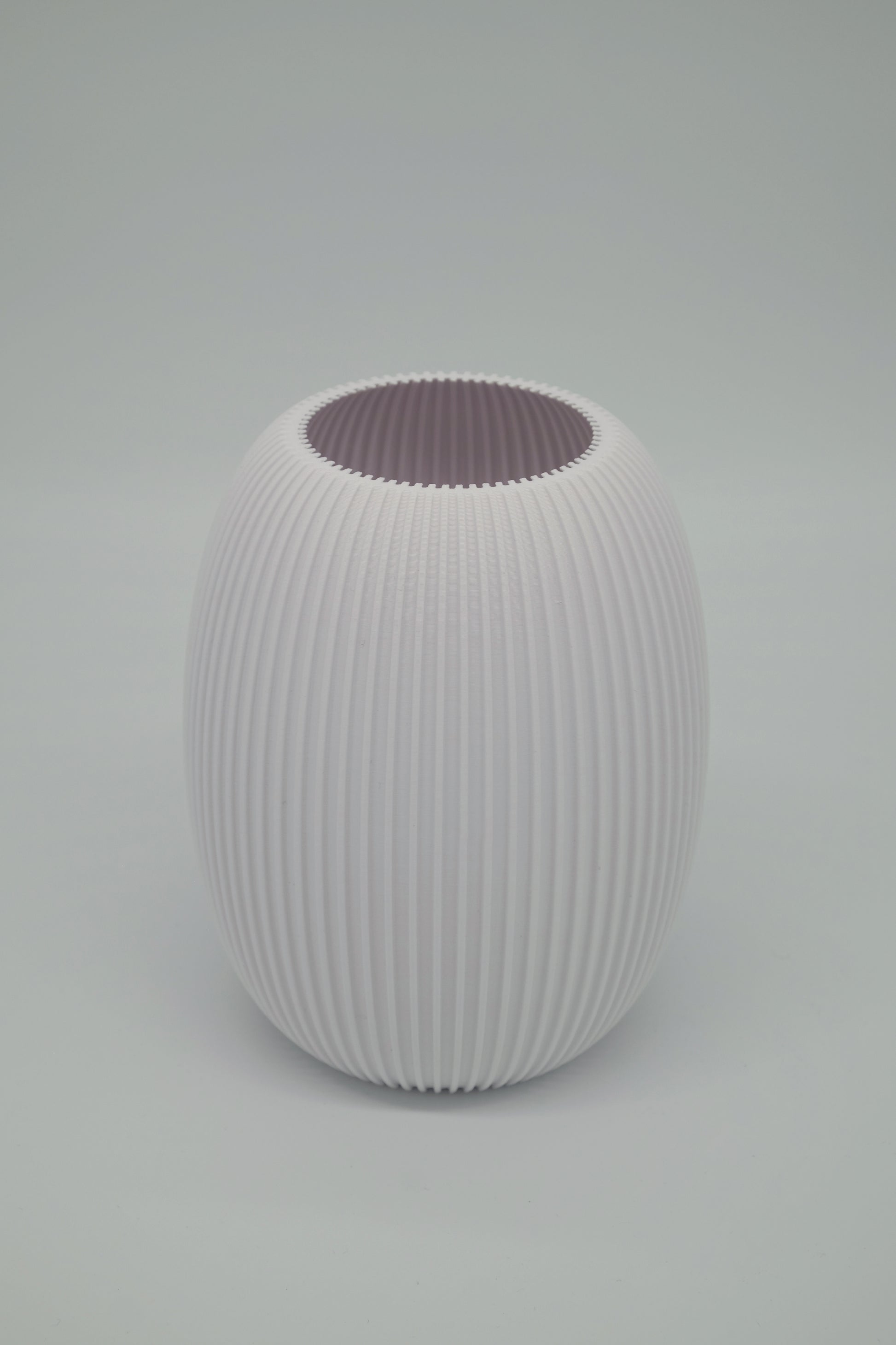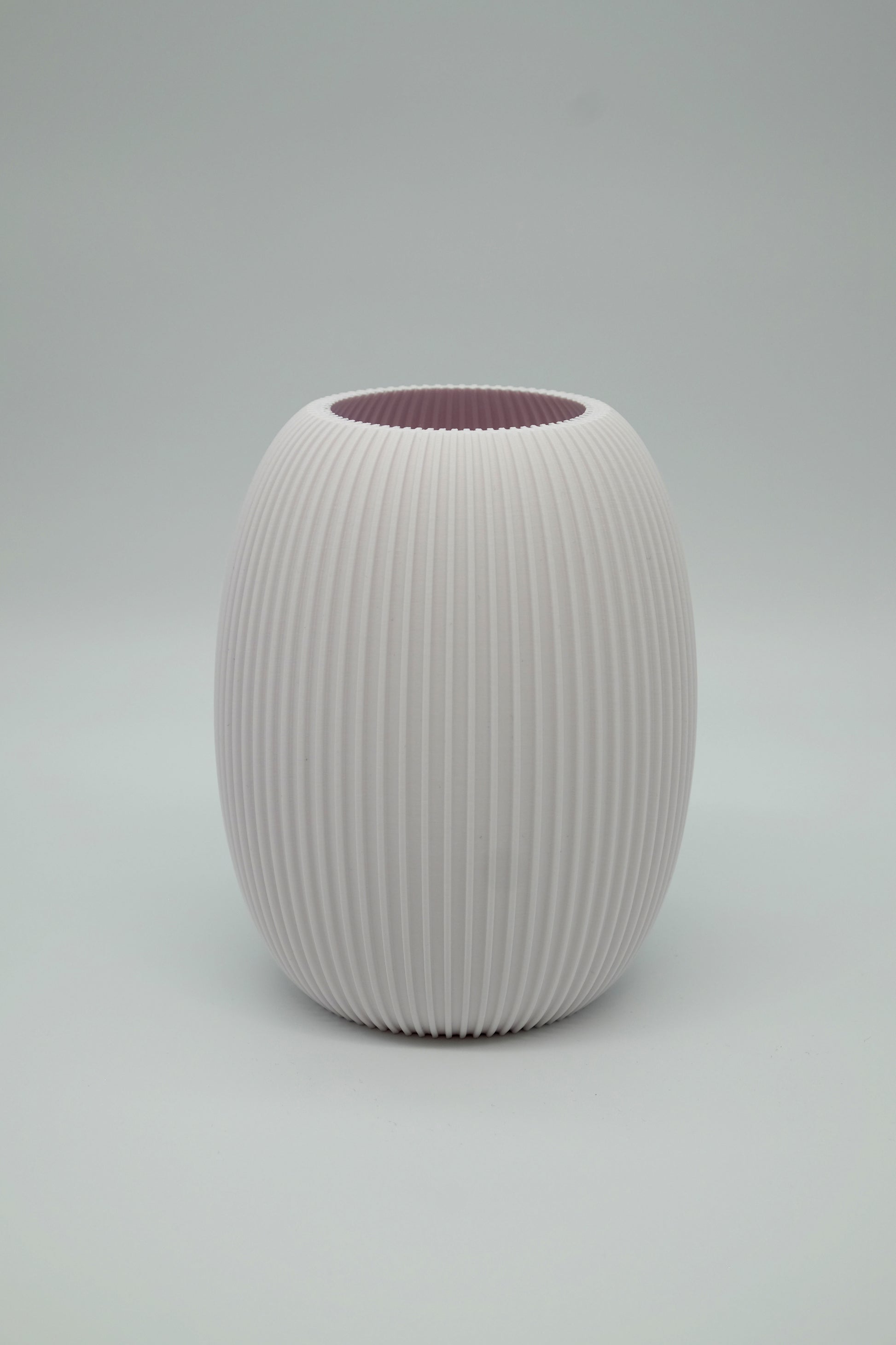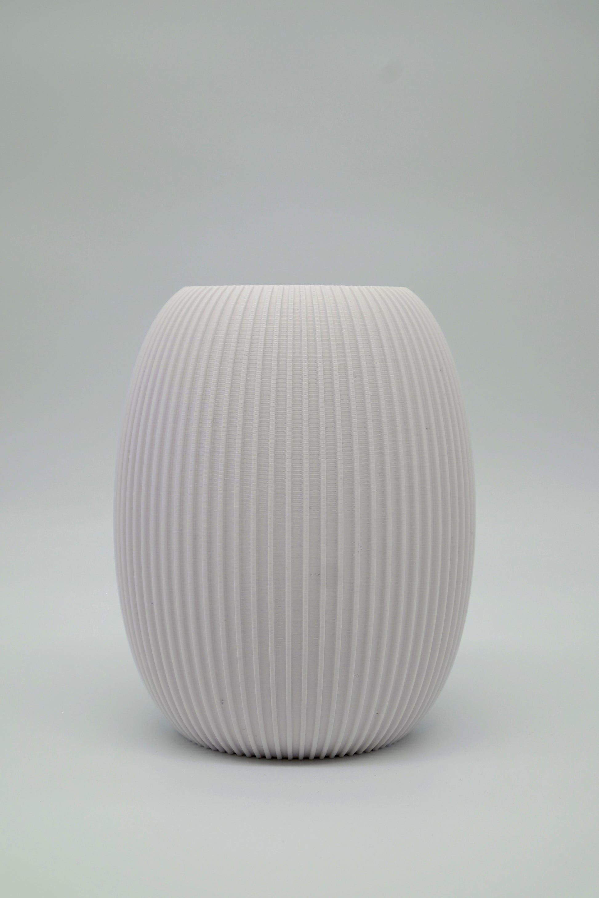 Die Oberfläche ist vollständig mit umlaufenden vertikalen Lamellen überzogen. Als einzigartiges Alleinstellungsmerkmal verlaufen diese Lamellen innen und außen durchgängig. Dieses doppelte Rillenspiel sorgt für eine faszinierende optische Tiefe und unterscheidet die Arvo Vase von herkömmlichen Keramikvasen.