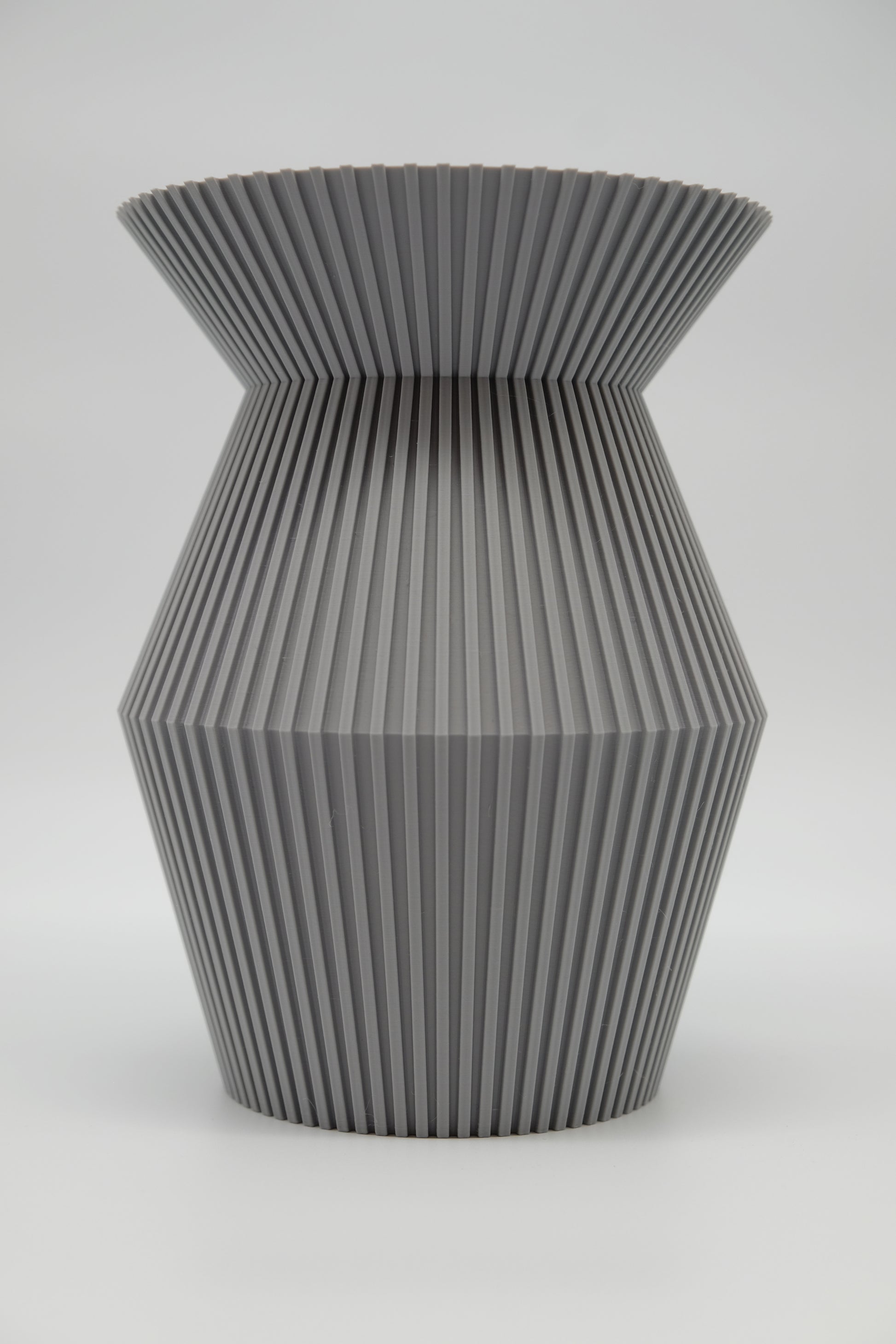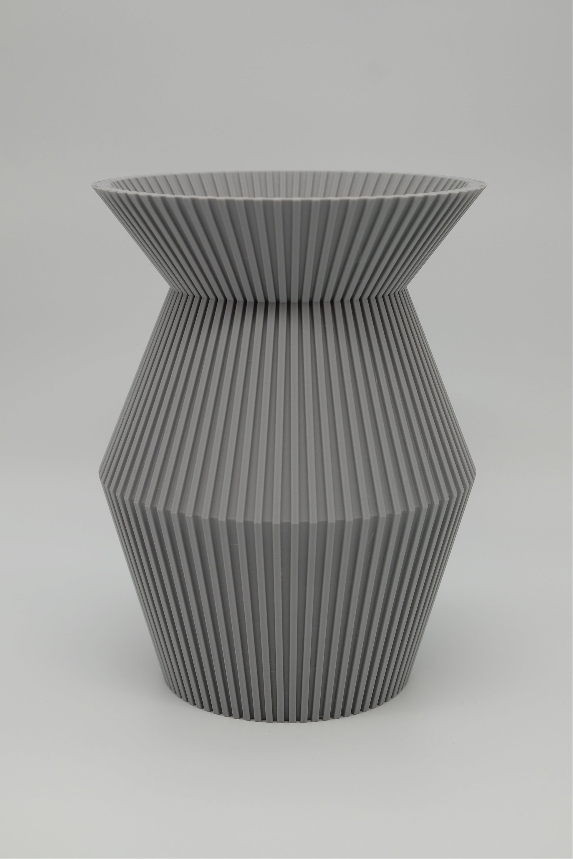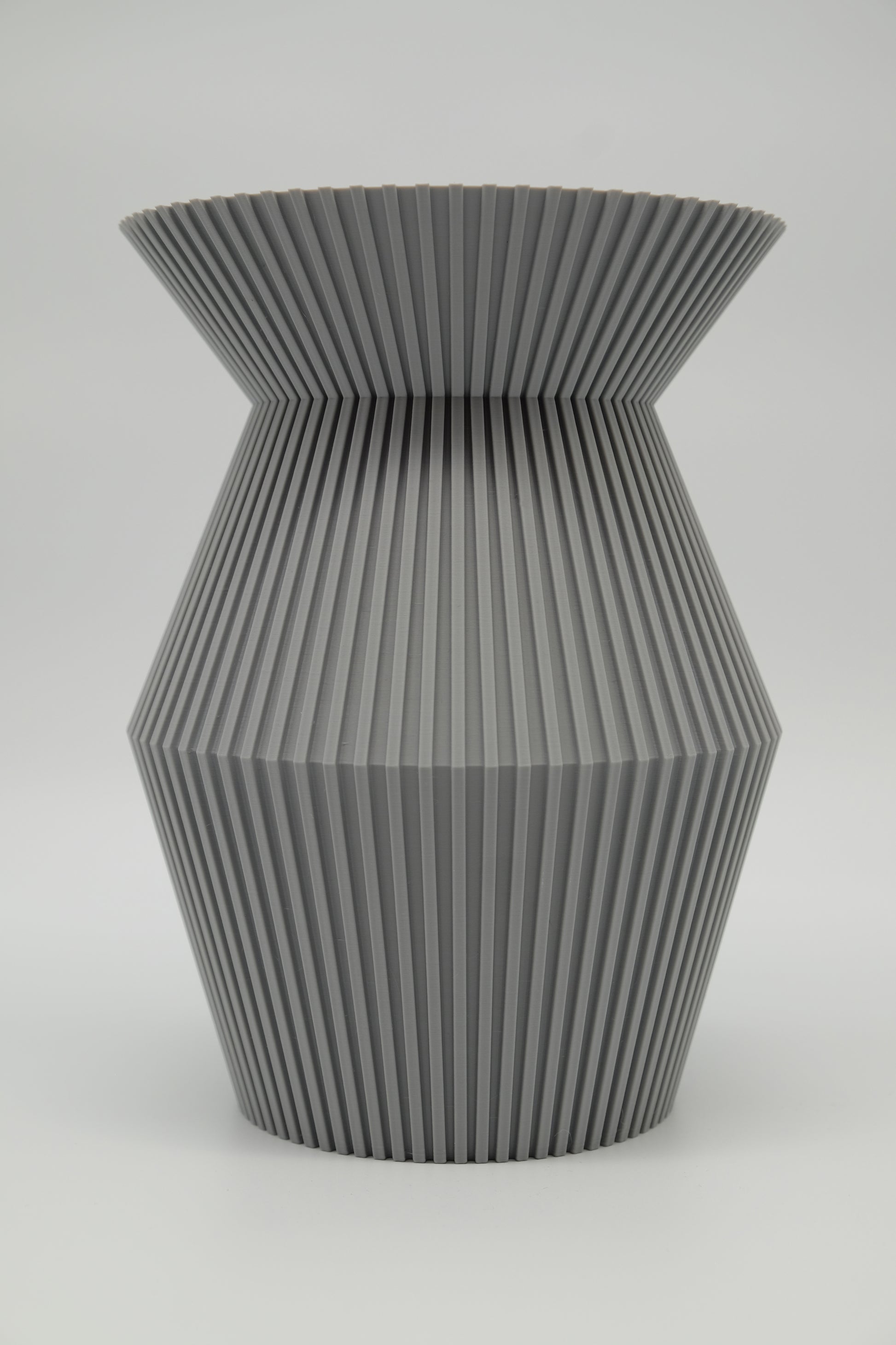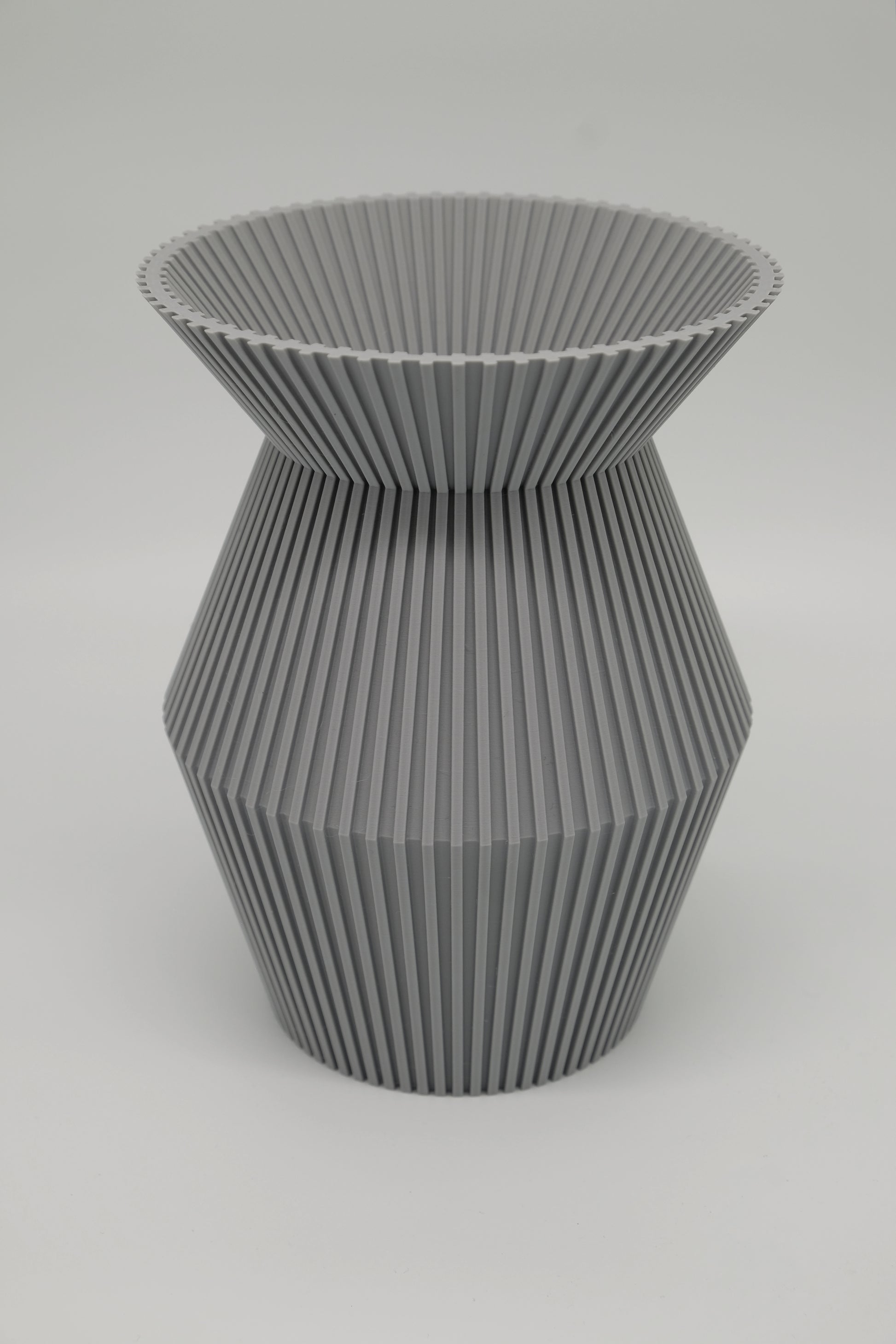 Diese einzigartige Vase kombiniert konische Formen mit einer markanten Silhouette. Das Highlight und Alleinstellungsmerkmal sind die vertikalen Lamellen, die innen und außen entlang der gesamten Oberfläche verlaufen. Diese doppelte Rillenstruktur sorgt für ein einmaliges Licht- und Schattenspiel und bietet eine unvergleichliche Tiefe.